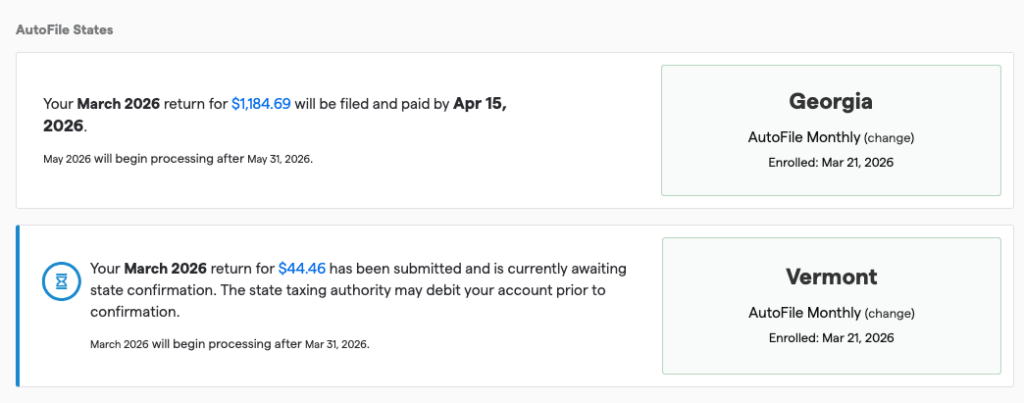This is the set -it-and-forget-it step. AutoFile automatically submits your state sales tax returns and payments to the state on your behalf. This is why platforms like Stripe Tax utilize TaxJar as their US filing partner—to leverage TaxJar’s proven AutoFile technology to handle filing and remitting to state tax authorities.