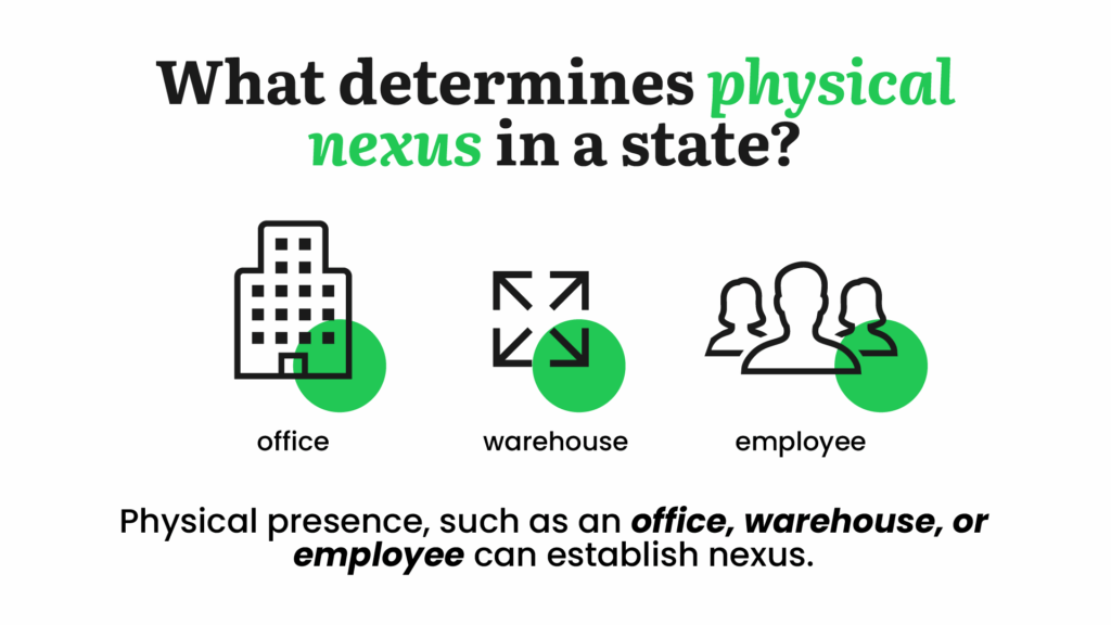 Sales tax nexus determines where you need to collect and remit sales tax. Physical presence, such as an office, warehouse, or employee can establish nexus.