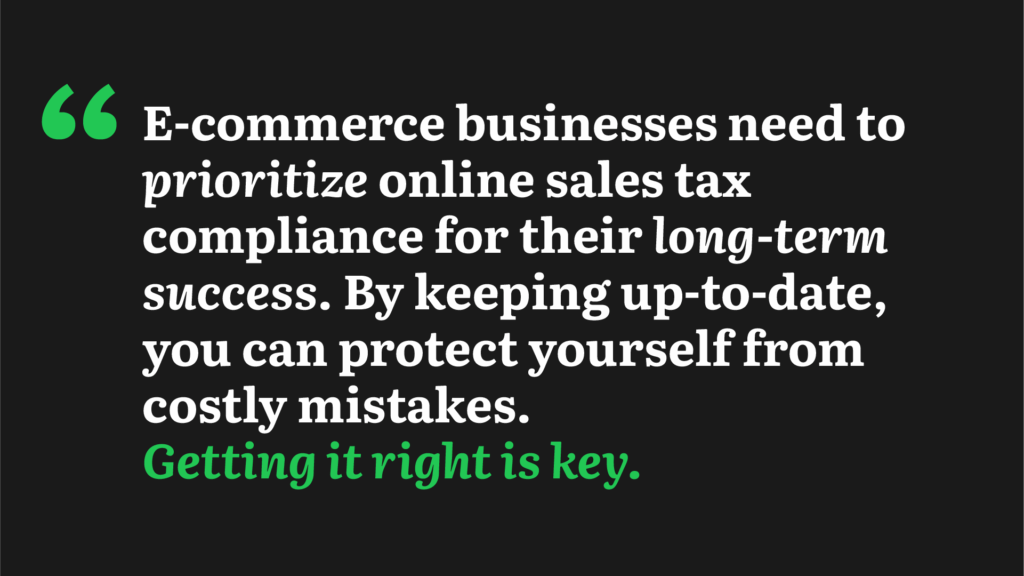 E-commerce businesses need to prioritize online sales tax compliance for their business’ long-term success. By keeping up-to-date, you can protect yourself from costly mistakes. Getting it right is key.